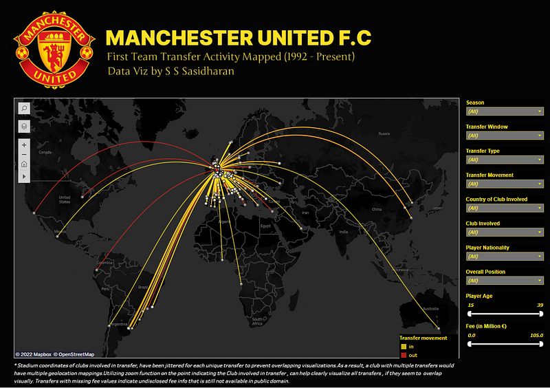 The transfers are represented in the form of a hub and spoke diagram, with the end and start points of the spoke representing the Geo-location of the two clubs involved in the transfer. Multiple filter options have been implemented to help the user quickly get to the information they want.