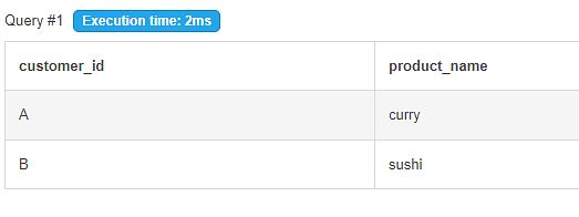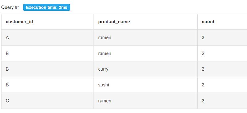 (select s.customer_id, m.product_name, count(s.product_id), dense_rank() over (partition by s.customer_id order by count(s.product_id) desc) as rank