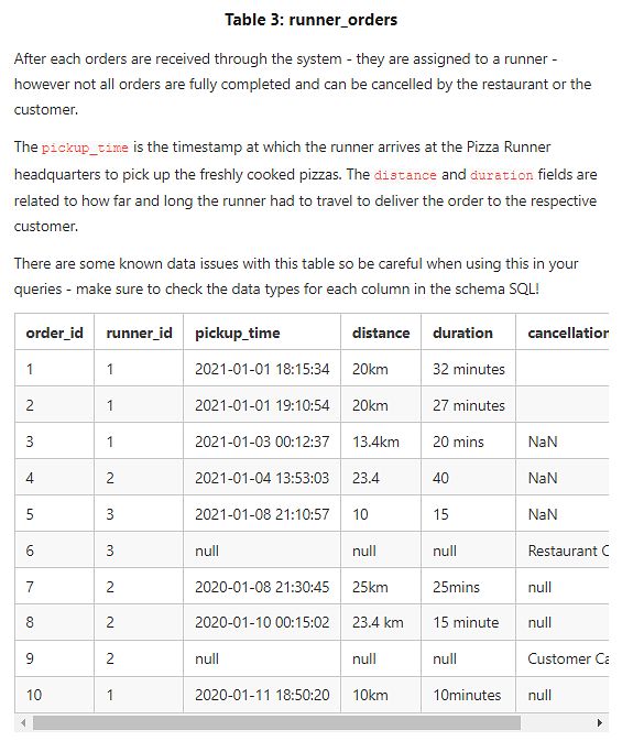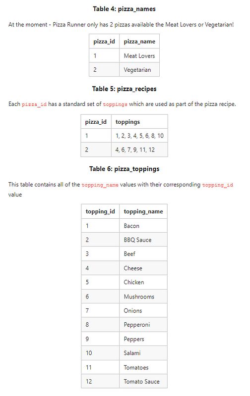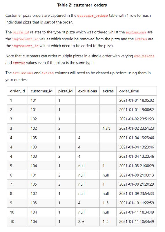 Before you start writing your SQL queries however - you might want to investigate the data, you may want to do something with some of those null values and data types in the customer_orders and runner_orders tables!