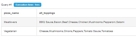 select pizza_name, string_agg(t.topping_name, ',' order by t.topping_name) as all_toppings