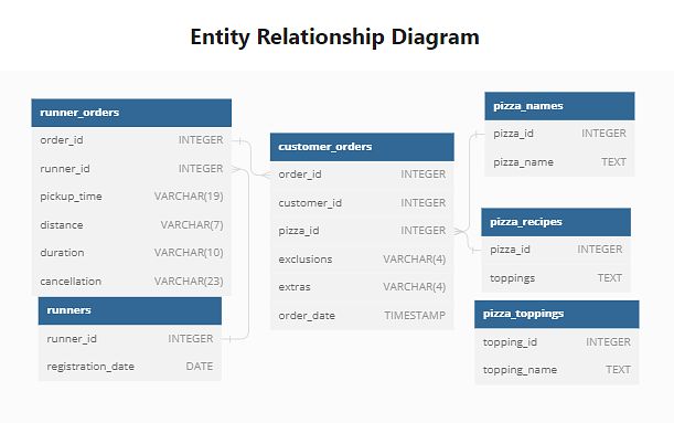 He has prepared for us an entity relationship diagram of his database design but requires further assistance to clean his data and apply some basic calculations so he can better direct his runners and optimise Pizza Runner’s operations.
