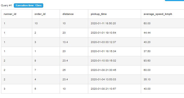 select runner_id, order_id, distance, pickup_time, round(cast(distance as numeric)/(cast(duration as numeric)/60),2) as average_speed_kmph